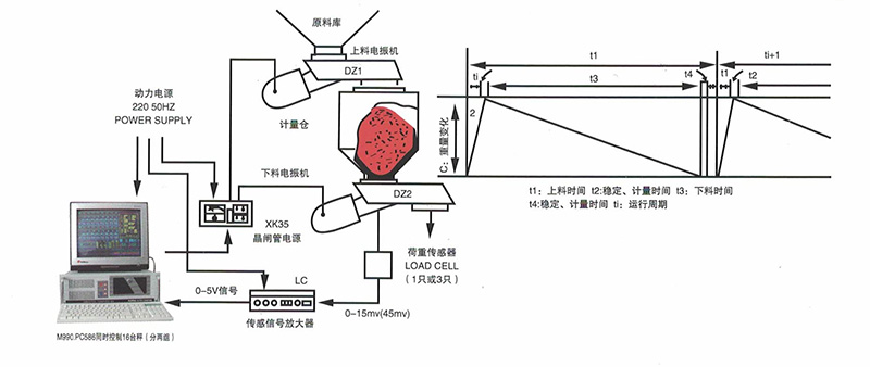 上料電振機(jī)和稱量斗是軟連結(jié)的,重力分離,下料電振機(jī)雖也是軟連結(jié),但其重力和稱量斗整體由三只拉力傳感器支撐的,由稱量斗內(nèi)料柱連結(jié)。工作時(shí)首先由上料電振機(jī)向稱量斗給料,當(dāng)達(dá)到料倉(cāng)給定重量的給定上限值時(shí),停止給料。間隔一段時(shí)間后,下料電振機(jī)開(kāi)始卸料,當(dāng)卸料至給定的重量下限值時(shí),停止卸料;如此重復(fù)動(dòng)作。物料的流量計(jì)量是由料倉(cāng)內(nèi)失去的物料重量多少來(lái)確定,因此叫失重定量給料機(jī)。