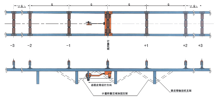 說明:1、測速車及測速傳感器 2、稱重架 3、輔助輥 4、原輸送機托輥改制的計量托輥 5、輸送機框架